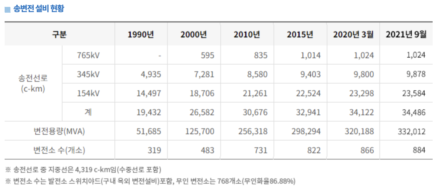 한국전력공사 자료에 따르면, 국내 송변전 설비는 아래와 같습니다.