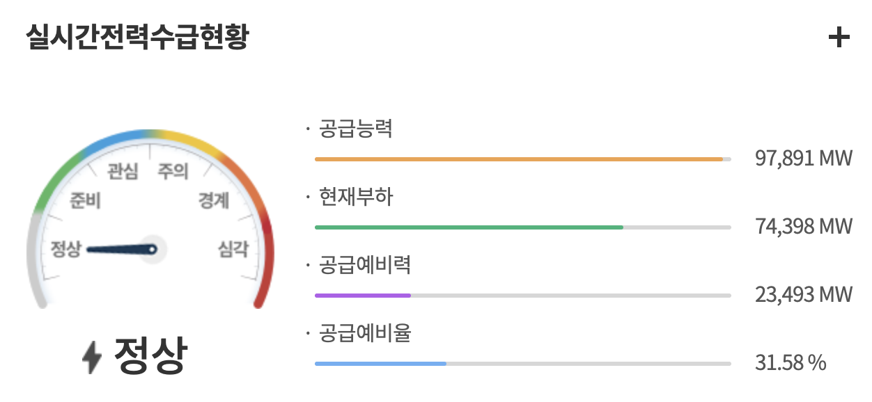공급능력은 97.89GW, 부하는 약 74,39GW로 31.58%의 예비율로 전력이 공급되는 것을 확인할 수 있습니다.