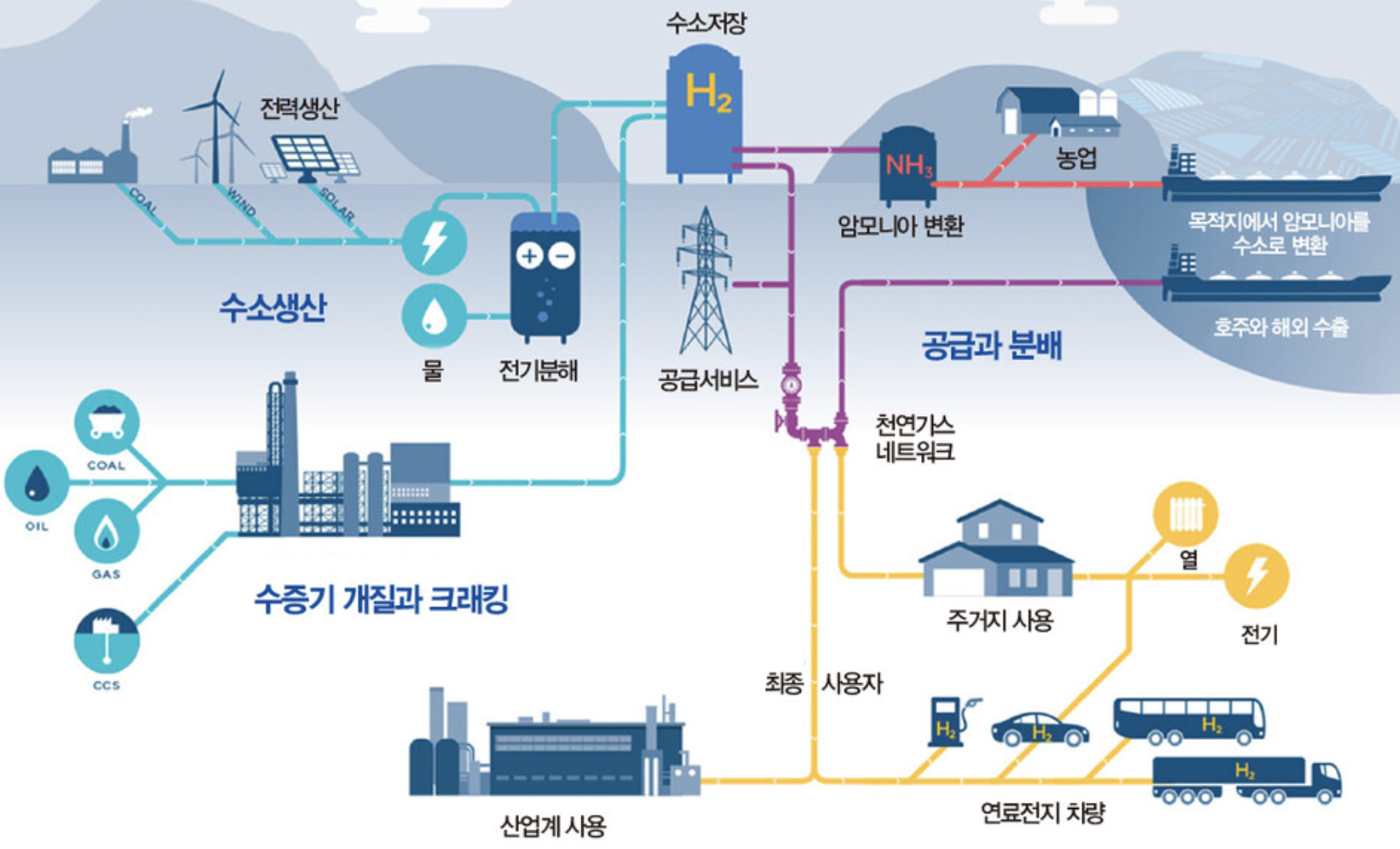 * 수소 생산: 수소를 생산하는 단계로, 크게 재생에너지를 활용한 수소 생산과 화석 연료를 활용한 수소 생산으로 구분됩니다.