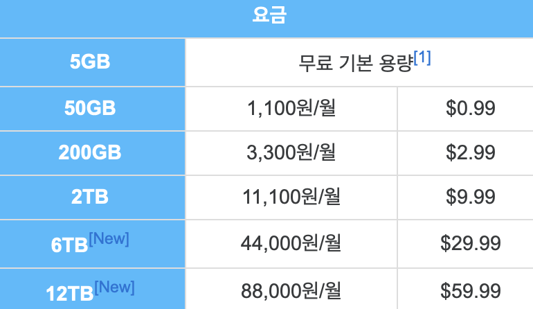 iCloud의 요금제는 다음과 같습니다.