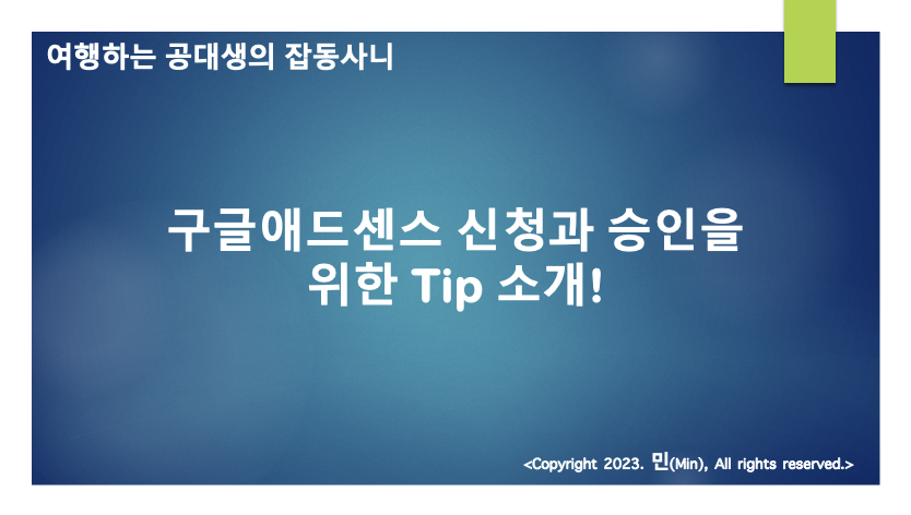 안녕하세요 여러분, 블로그 주인장 Min 입니다. 이번 글은 많은 블로거, 유튜버들이 관심을 가지실만한 특별한 글을 써보고자 합니다. 바로 구글애드센스 신청과 승인을 위한 Tip에 대한 이야기 입니다.