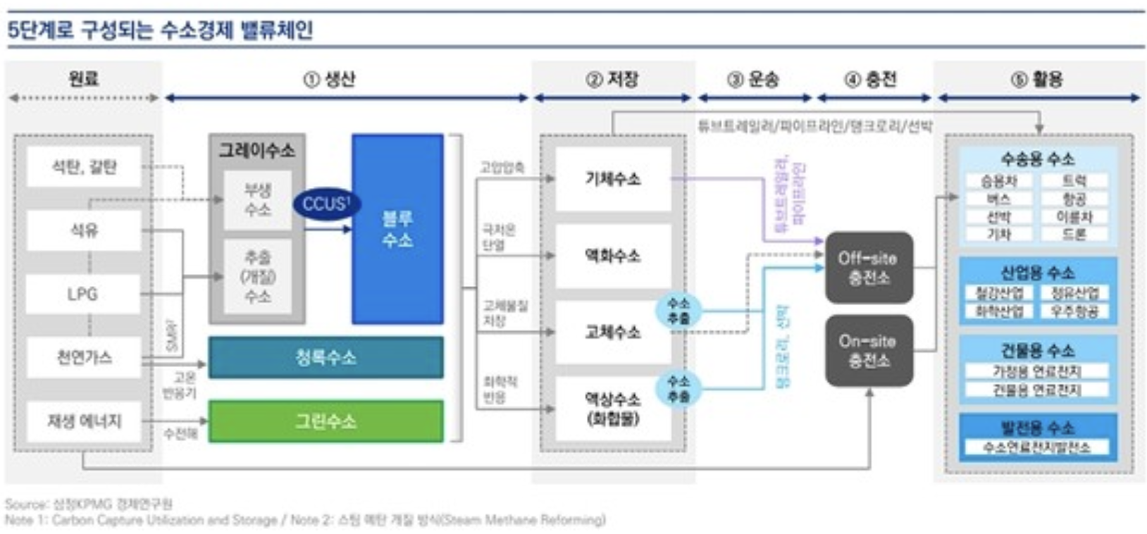 조금 더 세부적으로 나눠보자면, 한국의 수소 시장은 크게 그레이 수소와 블루 수소로 나눌 수 있습니다. 그레이 수소는 천연가스나 석탄을 분해하여 생산하는 수소로, 블루 수소는 그레이 수소 생산 과정에서 발생하는 이산화탄소를 포집하여 저장하는 수소입니다.