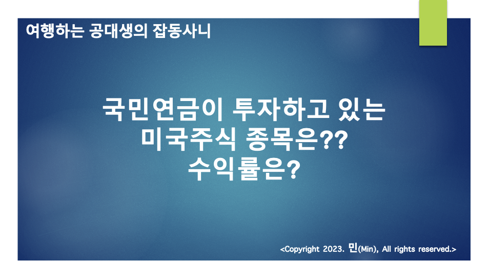 여러분 안녕하세요 민(Min)입니다. 이번 포스팅에서는 우리나라 국민연금공단에서 투자하고 있는 미국주식 종목에 대한 이야기를 해보고자 합니다.