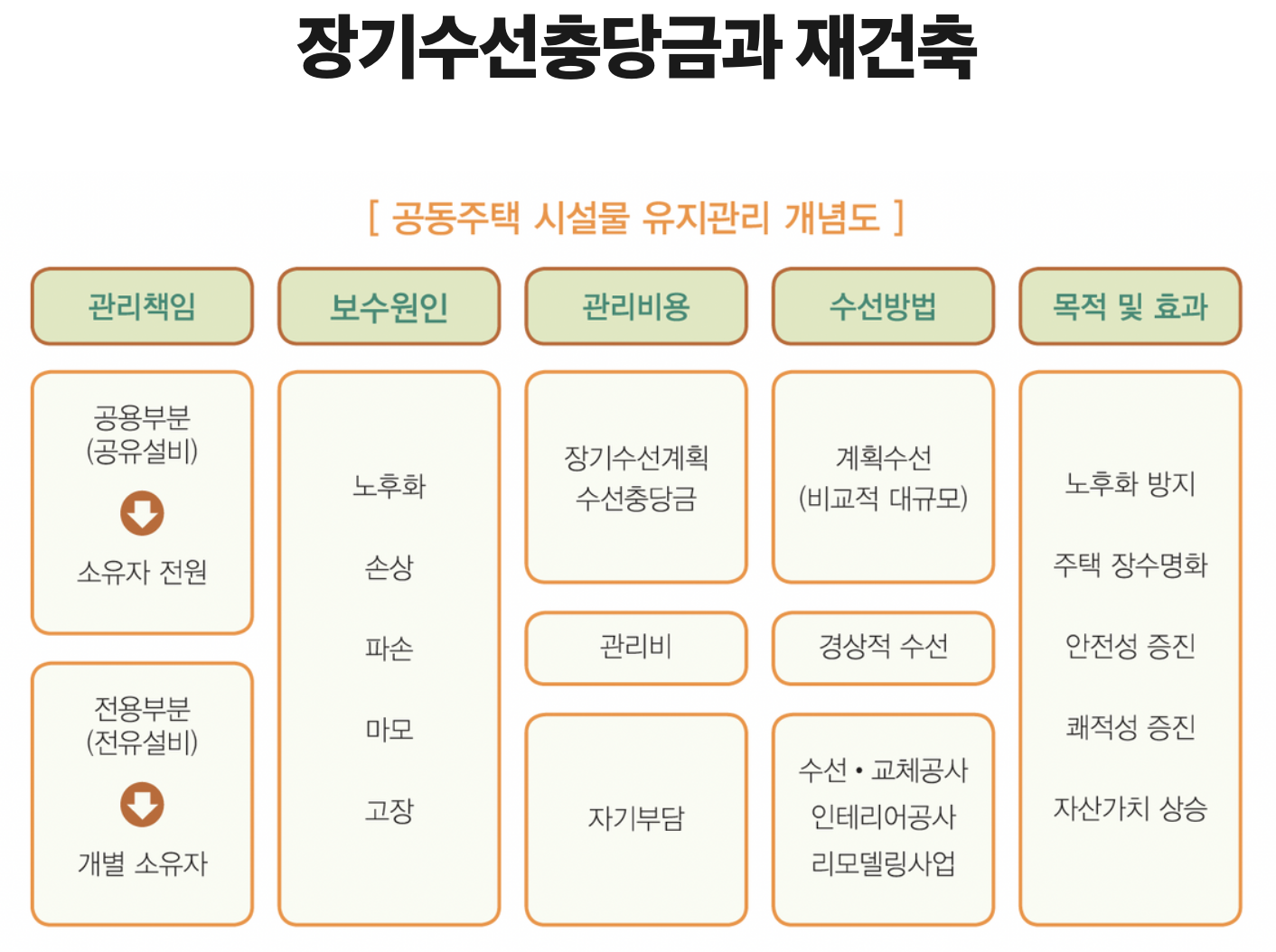 장기수선충당금이란 공동주택의 보수·개축·교체 등 장기수선에 필요한 비용을 미리 적립해 두는 금액을 말합니다. 공동주택의 구조·설비의 노후화로 인한 붕괴·화재·침수 등의 재해를 예방하고, 입주자의 주거 안정을 도모하기 위해 마련된 제도입니다.