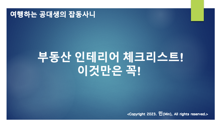안녕하세요 여러분, 민(Min)입니다. 이번 포스팅에서는 부동산 인테리어시 체크해야하는 필수 항목들에 대한 이야기를 풀어보고자 합니다.