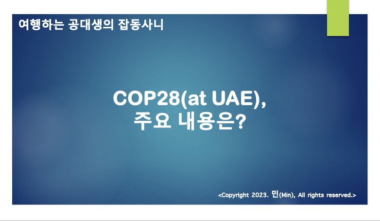 안녕하세요 여러분 민(Min) 입니다. 이번 포스팅에서는 COP28에서 언급된 주요내용에 대한 이야기를 나눠보고자 합니다.
