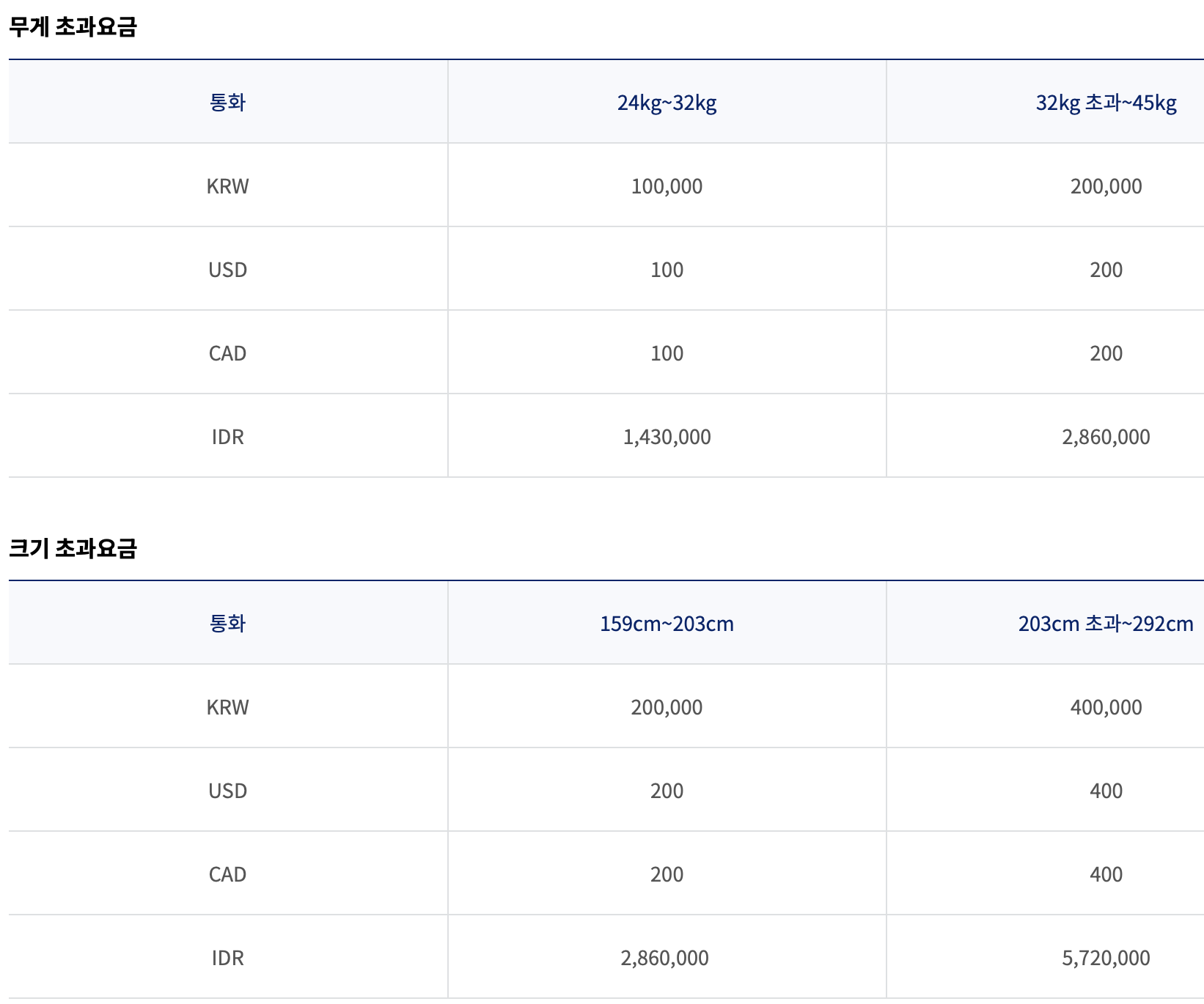 규정 수하물 허용치 초과시 부과되는 요금이 있습니다. 아래와 같습니다.