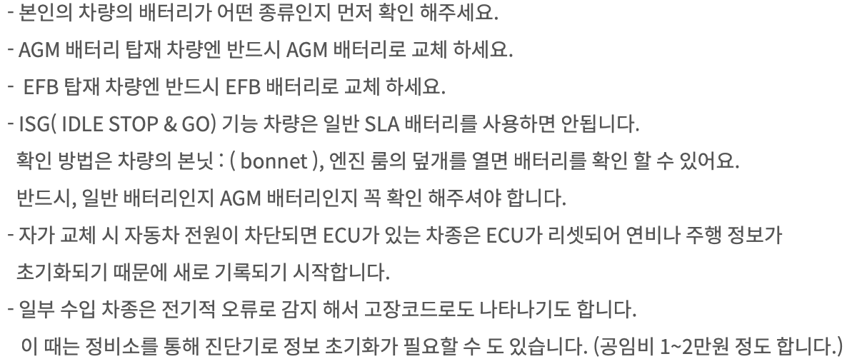 차종마다 다르므로, 배터리 용량과 단자 위치는 필수 확인 사항 입니다.