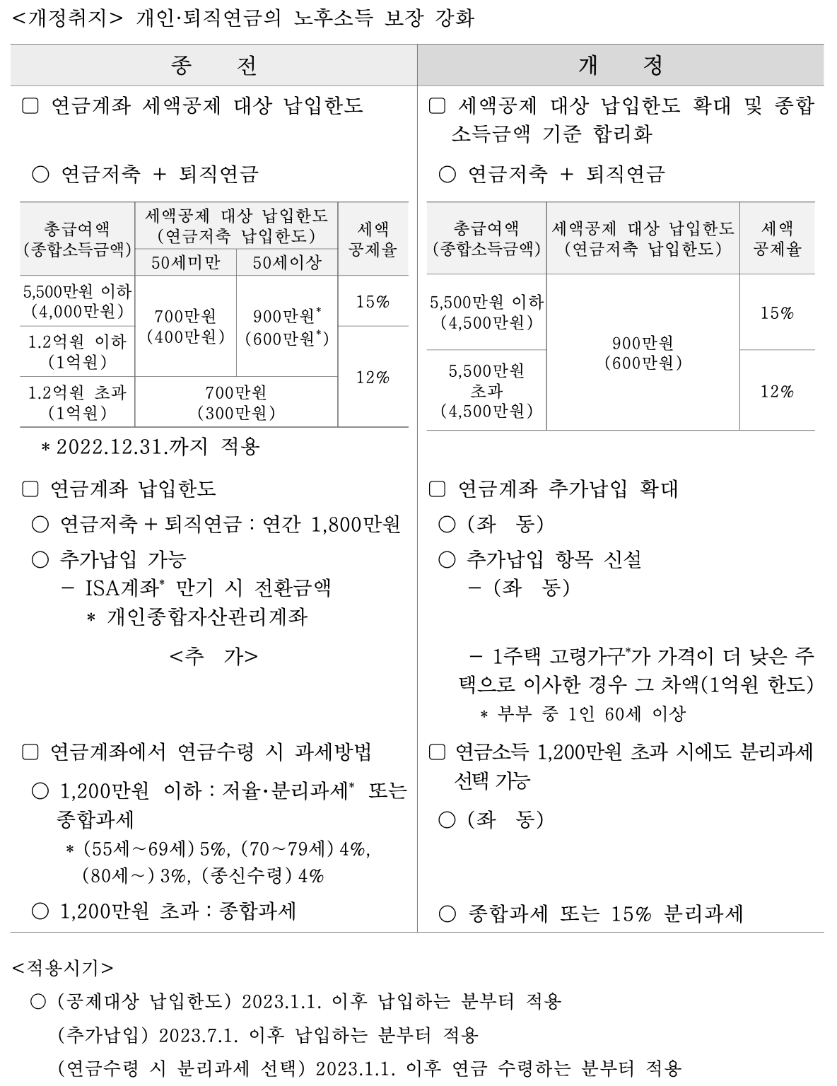 *즉, 연금저축 납입한도가 늘어났습니다. (400만원, 월 33만원 -> 600만원, 월 50만원) 퇴직연금은 기존과 같이 연간 300만원이므로, 12로 나눠보면 월 25만원이 Max인 금액이라고 할 수 있겠네요.