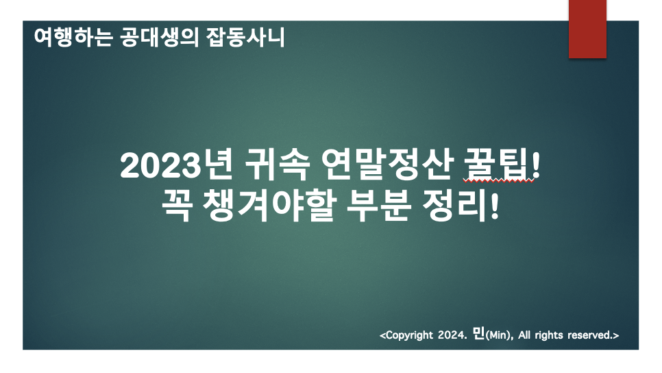 여러분 안녕하세요 민(Min) 입니다. 이번 포스팅에서는 2023년 귀속 연말정산을 앞두고 팁!이라고 할 수 있는 부분에 대하여 포스팅을 해보고자 합니다.