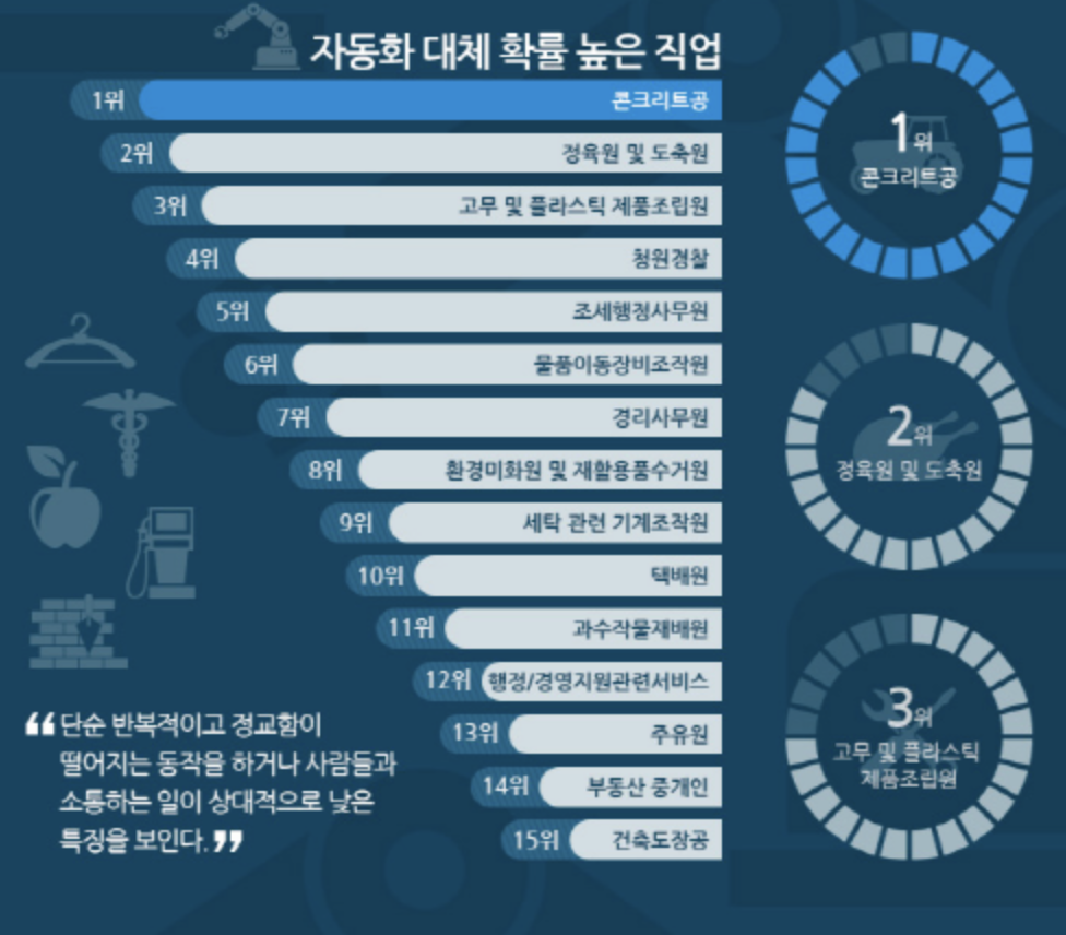 즉, 위의 직업들은 AI와 함께 일할 수 있는 여건의 조성이 빠르게 진전될 것이라고 판단해보는 것이 좋겠습니다.