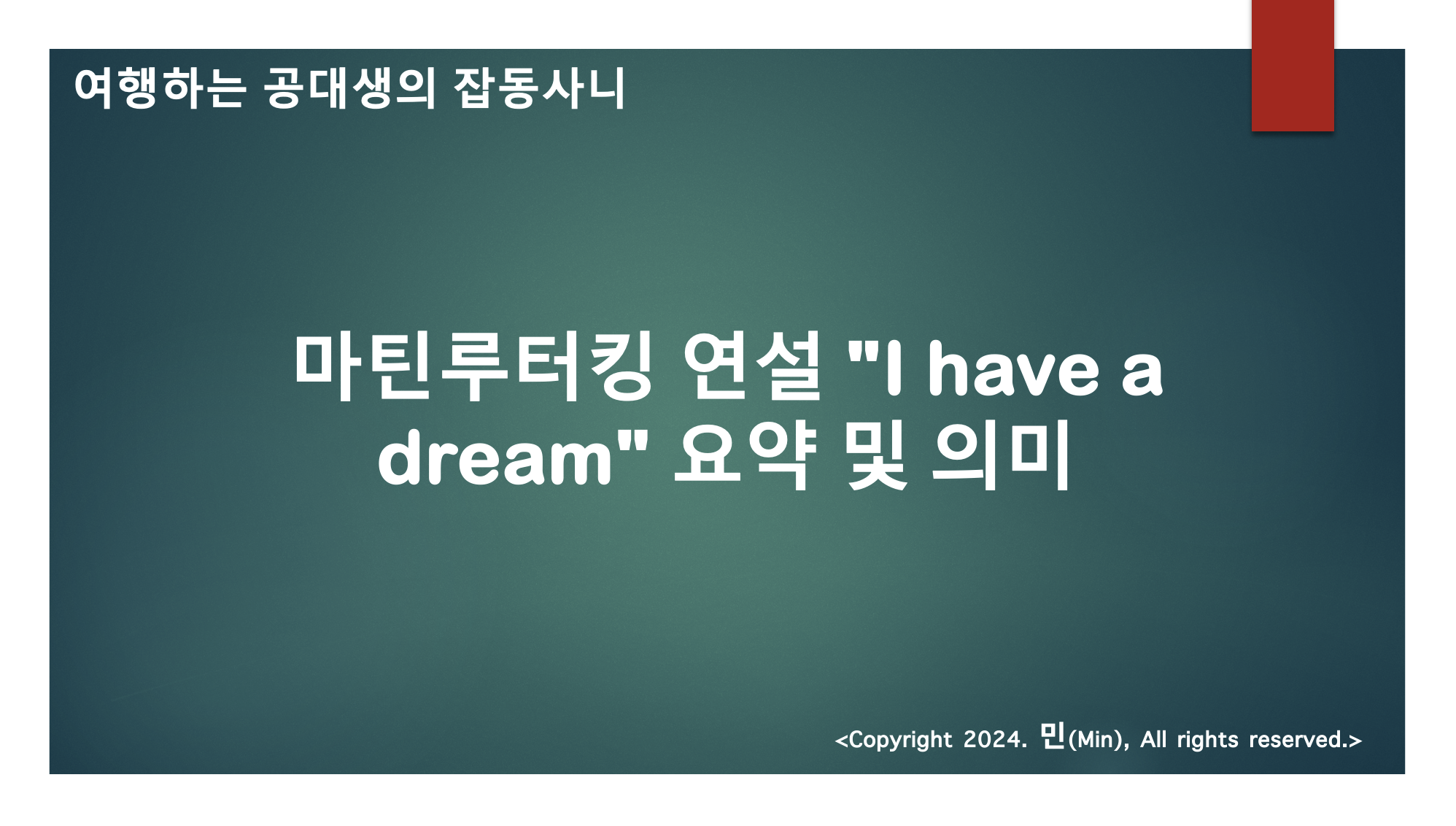 안녕하세요 여러분 민(Min) 입니다. 이번 포스팅에서는 1963년 마티루터킹이 "I have a dream"의 주제로 연설한 내용에 대한 해석을 살펴보고자 합니다.