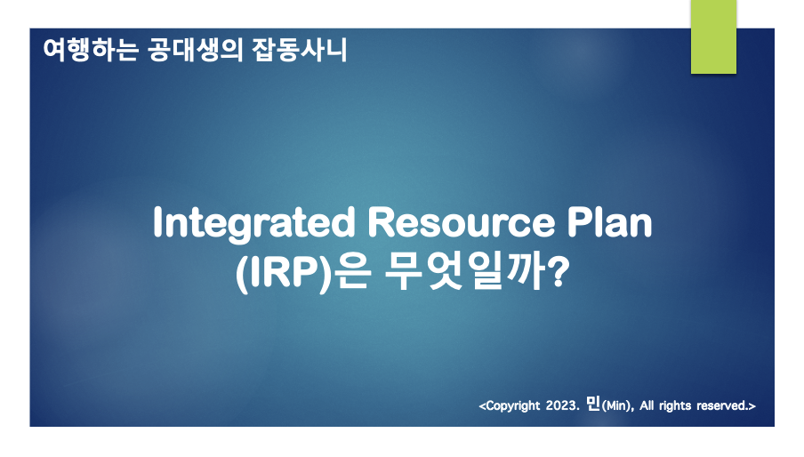 이상 IRP에 대하여 간략하게 알아보았습니다. 전략적이고 획기적인 IRP를 통하여 효율적인 에너지 자원 설계가 되기를 바래봅니다.
