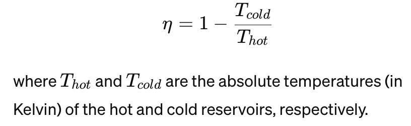 여기서 \(T_{hot}\) 및 \(T_{cold}\)는 각각 뜨거운 저장소와 차가운 저장소의 절대 온도(켈빈 단위)입니다.