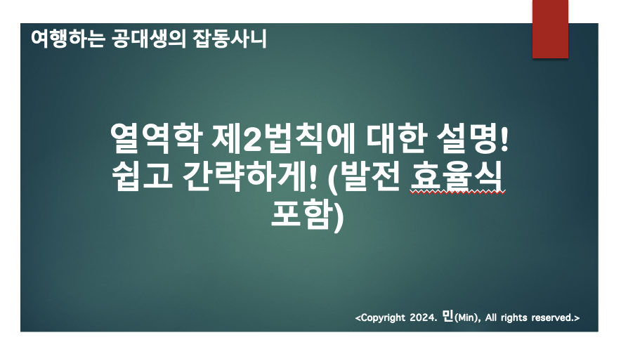 안녕하세요 여러분 민(Min) 입니다. 이번 포스팅에서는 열역학 제2법칙에 대한 간략한 설명 그리고 발전 효율식에 대한 이야기를 해보고자 합니다.