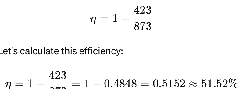 연소 발전소가 600°C(873K)의 고온 증기로 작동하고 150°C(423K)의 열을 배출한다고 가정해 보겠습니다. 이론적 최대(카르노) 효율은 다음과 같이 계산할 수 있습니다.