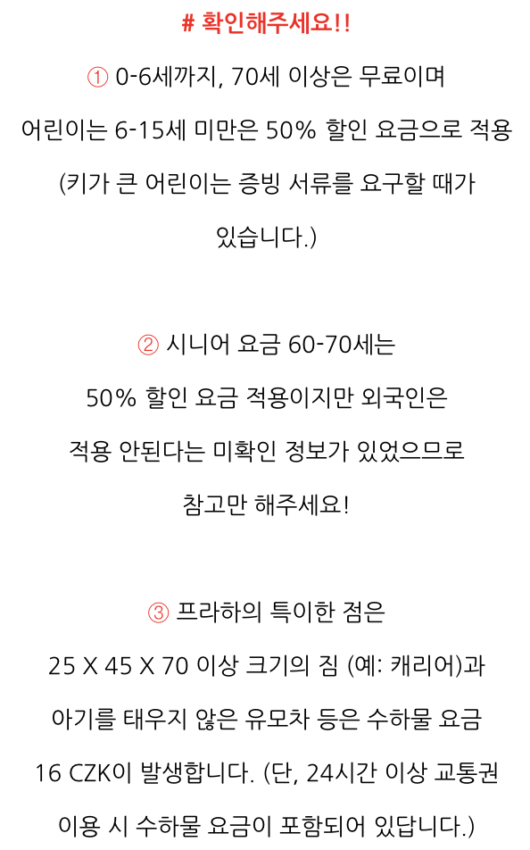 - 프라하 대중교통은 매우 안전하지만 소지품 관리에는 항상 주의해야 합니다.