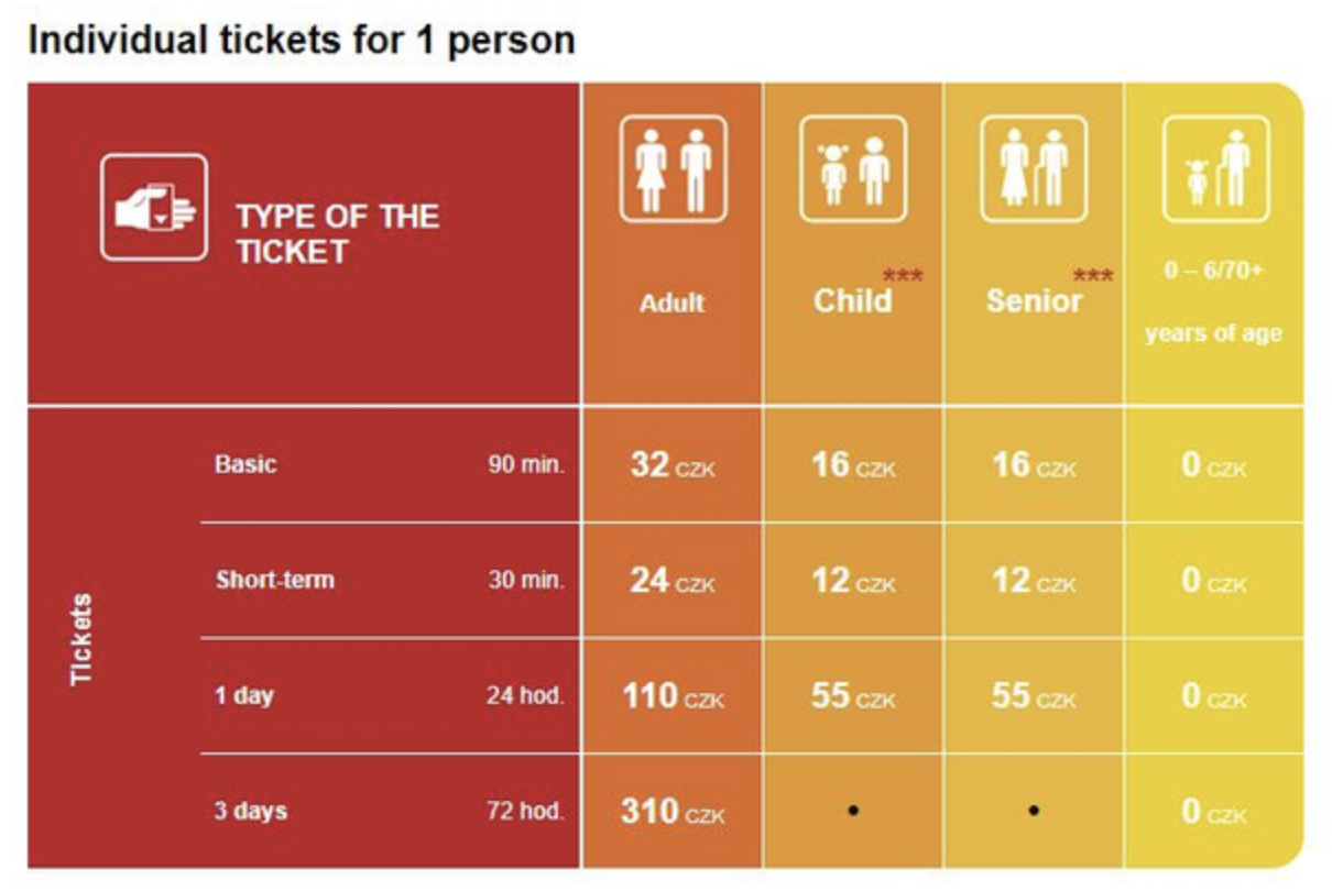 프라하 대중교통은 거리 및 시간 기반 요금제를 사용합니다. 티켓은 다음과 같은 방법으로 구매할 수 있습니다: