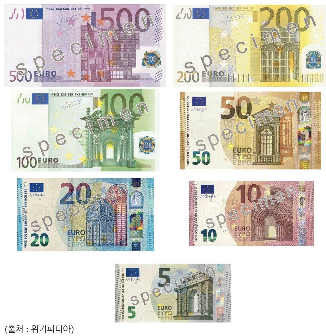 - 종류: €5, €10, €20, €50, €100, €200, €500