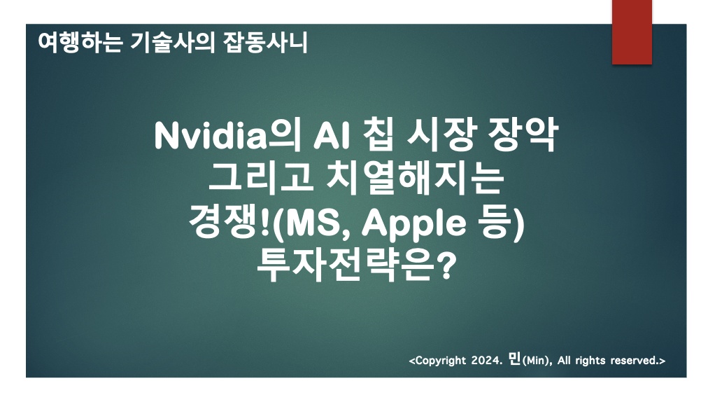 여러분 안녕하세요 민(Min) 입니다. 이번포스팅에서는 Nvidia의 AI칩 엄청난 점유율과 치열해지는 경쟁에 대한 포스팅을 작성해보고자 합니다. 매우 흥미롭고, 세계 경제의 흐름을 파악하는데 중요한 지표의 역할을 할 것이라고 생각합니다.