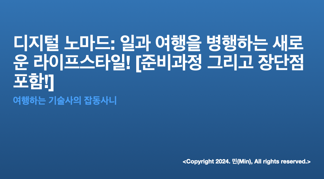 안녕하세요 여러분 민(Min) 입니다. 이번 포스팅에서는 [디지털 노마드: 일과 여행을 병행하는 새로운 라이프스타일]에 대한 주제로 여러분들과 공유하고자 합니다.