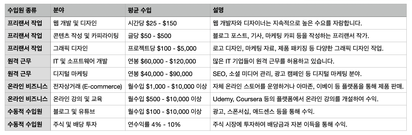 - 설명: 블로그 포스트, 기사, 마케팅 카피 등을 작성하는 프리랜서 작가는 많은 기업과 개인 클라이언트를 대상으로 작업할 수 있습니다. 글의 길이와 복잡성에 따라 수입이 달라질 수 있습니다.
