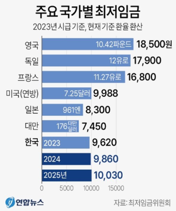 설명: 한국의 최저임금은 최근 몇 년간 꾸준히 상승해 왔으며, 이는 노동자들의 생활 수준을 개선하기 위한 정부의 노력을 반영합니다. 한국은 세계 10위권 경제 대국으로, IT와 제조업이 경제를 이끄는 주요 산업입니다.