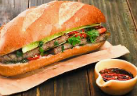 설명: 반미는 베트남식 바게트 샌드위치로, 쌀가루와 밀가루를 혼합한 바게트에 다양한 속재료를 넣어 만든다.