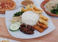 설명: 나시 레막은 말레이시아의 대표적인 음식으로, 코코넛 밀크와 판다 잎으로 향을 낸 밥에 매콤한 삼발 소스와 다양한 반찬이 함께 제공됩니다.