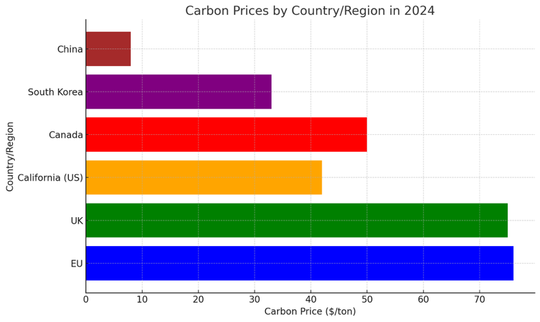 영국은 EU를 떠난 이후에도 독립적인 ETS를 운영하며, 현재 탄소 가격은 약 $75/ton에 달합니다. 영국의 탄소 가격 정책은 EU와 유사하게 강력한 규제를 특징으로 하며, 이는 특히 전력 및 산업 부문에서 적용됩니다.