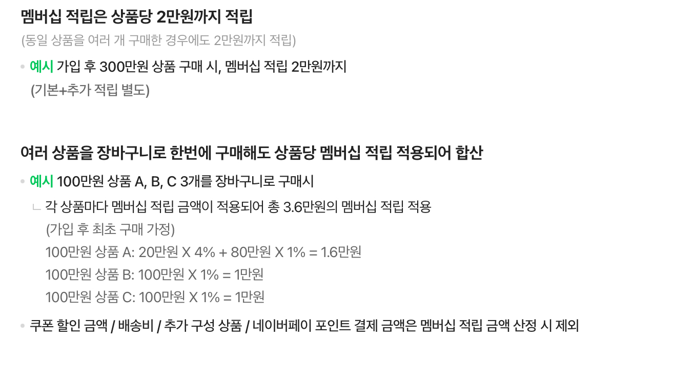 • 월간 20만 원 이하 쇼핑 시: 총 5% (기본 1% + 멤버십 4%)