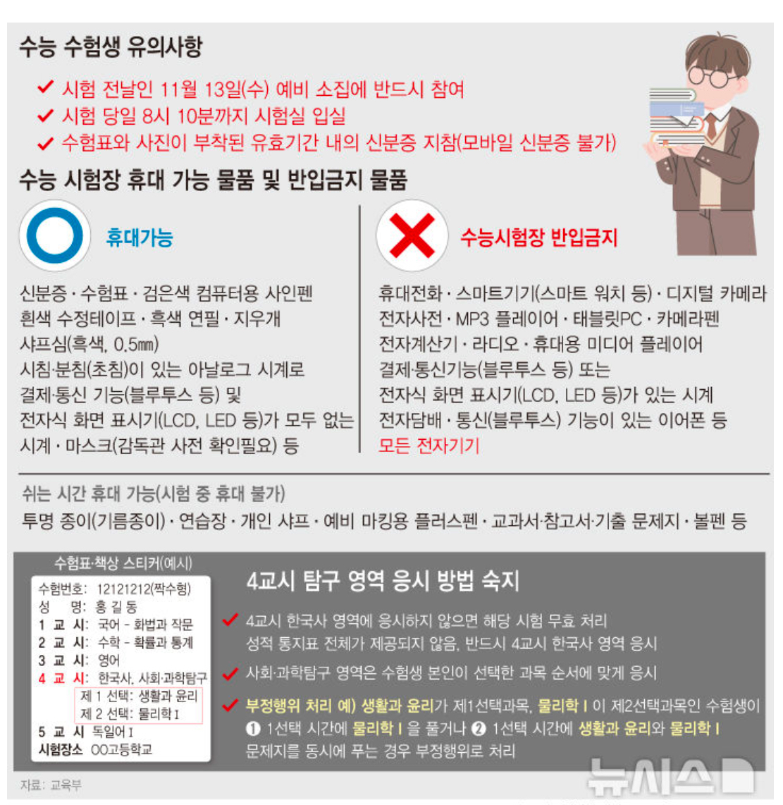 • 수험표: 수능 당일 시험장 입장에 꼭 필요한 물품이므로 잃어버리지 않도록 미리 확인하세요.