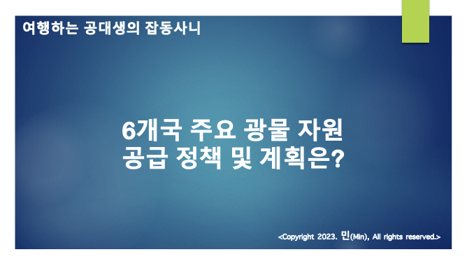 안녕하세요 민(Min) 입니다. 이번 포스팅에서는 6개국(EU, US, Japan, Canada, Australia and China) 주요 자원 공급 정책에 대하여 이야기를 나눠보고자 합니다.