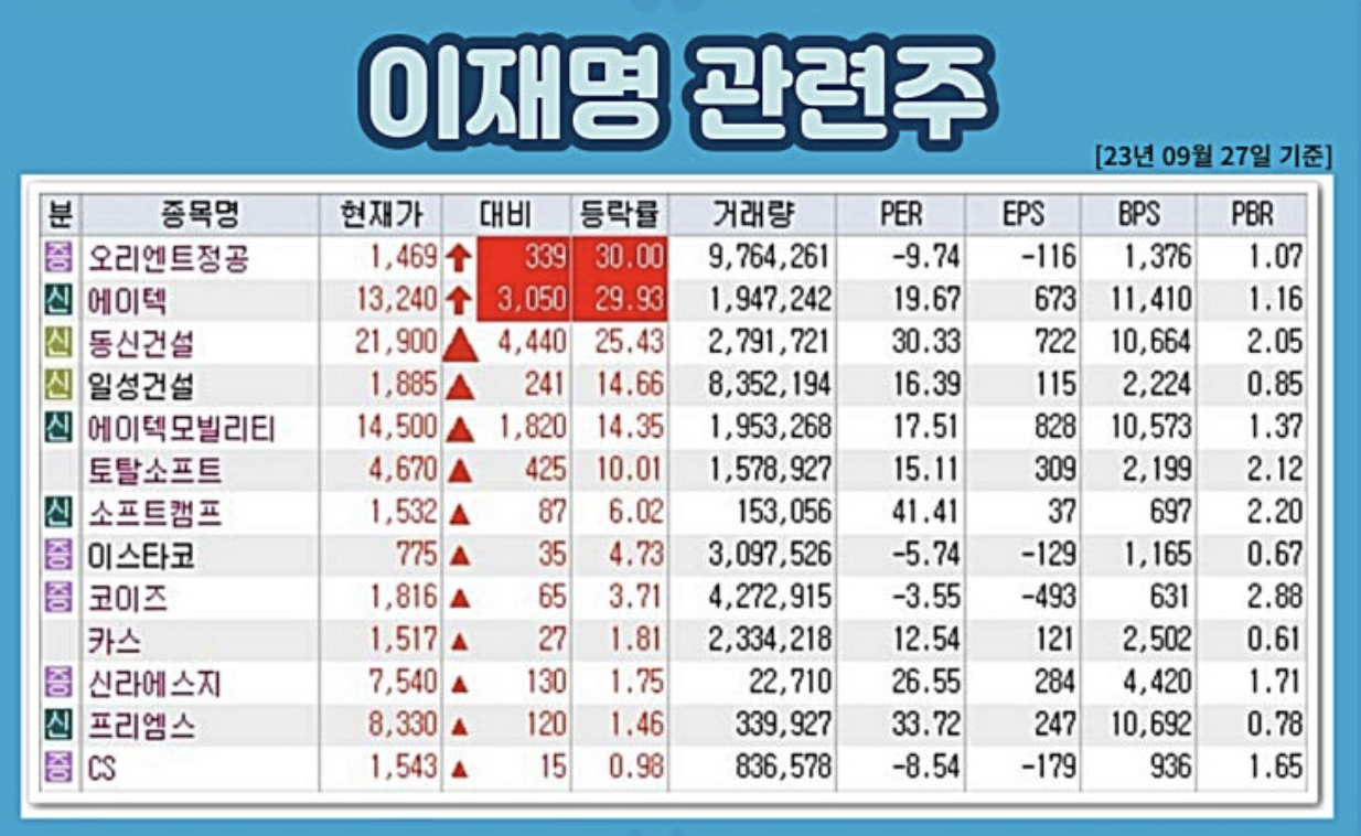 다음은 일반적으로 ‘이재명 관련주’로 언급되는 대표적인 기업들입니다: