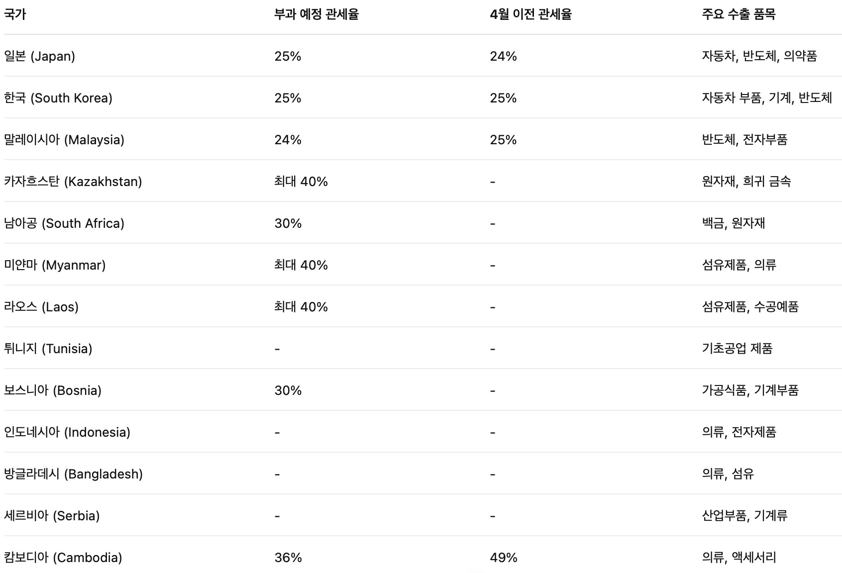 1. 대상 국가 및 부과 예정 관세율 요약
