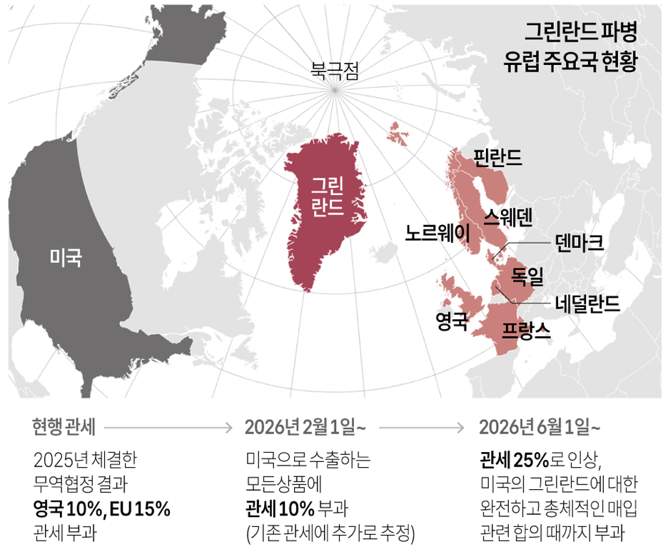 · 1차 제재 (2026.02.01~): 해당 국가들의 모든 대미 수출품에 10% 일괄 관세 부과.