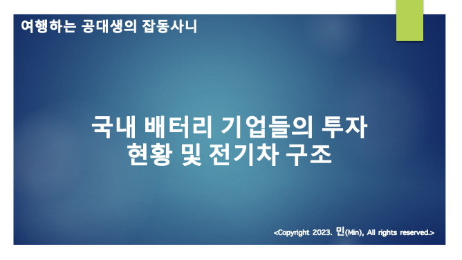 안녕하세요 민(Min) 입니다. 이번 포스팅에서는 국내 배터리 기업들의 추자 전략 및 전기차 내부에서는 과연 배터리가 어떻게 배치되고 운용 되는지 알아보고자 합니다.