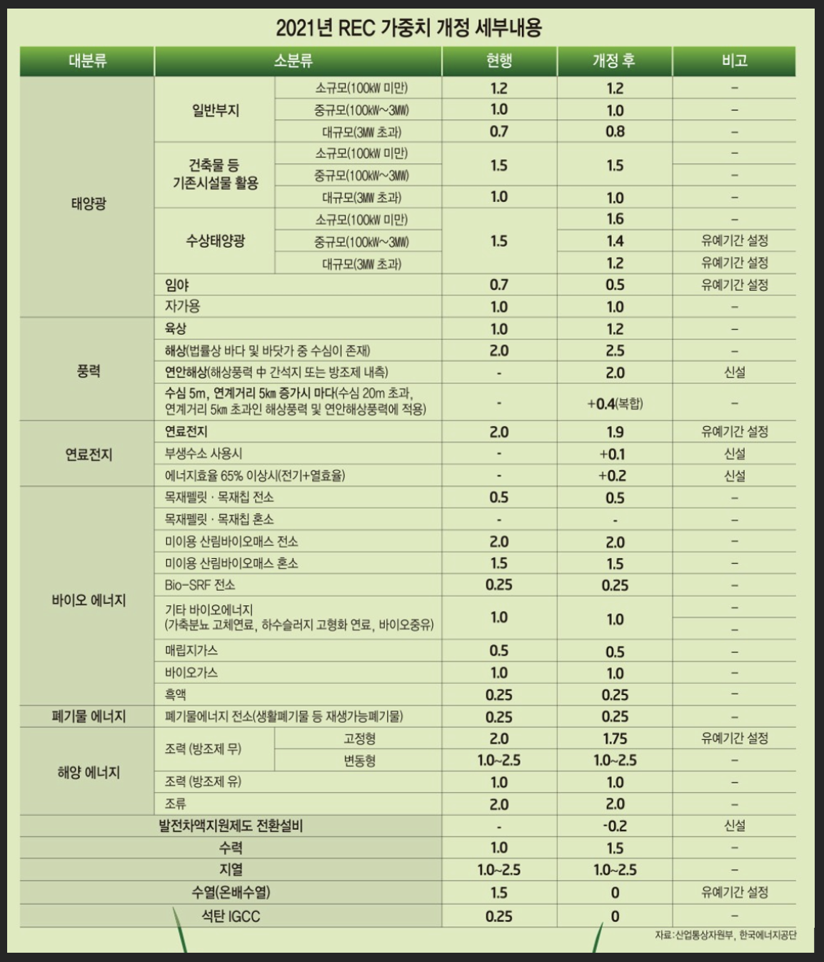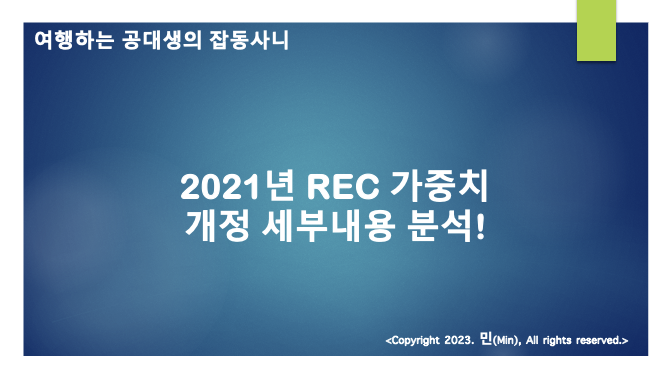 여러분 안녕하세요 민(Min) 입니다. 이번 포스팅에서는 2021년 산업부에서 발표한 REC 가중치 개정 세부내용에 대하여 여러분들과 공유하고자 합니다.